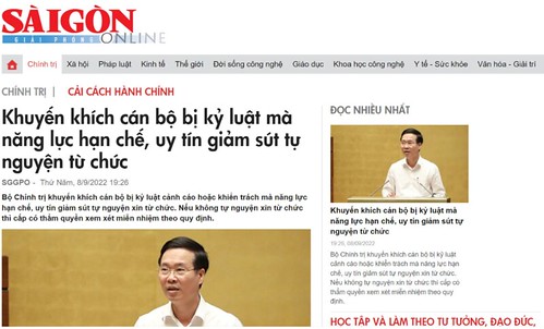 Bộ Chính trị Đảng Cộng sản Việt Nam, do Tổng bí thư Nguyễn Phú Trọng đứng đầu, vừa ra văn bản nói khuyến khích cán bộ bị kỷ luật cảnh cáo hoặc khiển trách "mà năng lực hạn chế, uy tín giảm sút, tự nguyện xin từ chức".