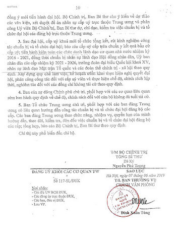 "Chỉ thị 35-CT/TW năm 2019 về đại hội đảng bộ các cấp tiến tới Đại hội đại biểu toàn quốc lần thứ XIII của Đảng do Ban Chấp hành Trung ương ban hành" được Tổng bí thư Nguyễn Phú Trọng ký ngày 30/5/2019, với 23 trang giấy khổ A4 ; và được phát hành qua bản sao lục số 117-SL/ĐUK do Chánh Văn phòng Đảng ủy khối các cơ quan trung ương, ông Đinh Xuân Tùng ký ngày 07/6/2019 (1).
