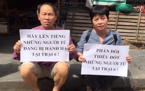 Ông Trương Văn Dũng và Nguyễn Thúy Hạnh trưng biểu ngữ kêu gọi bảo vệ người người tù đang bị hành hạ tại Trại 6 (huyện Thanh Chương, tỉnh Nghệ An),