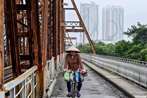 Một phụ nữ đạp xe đi qua cầu Long Biên ở Hà Nội hôm 14/8/2024 - Nhac Nguyen / AFP