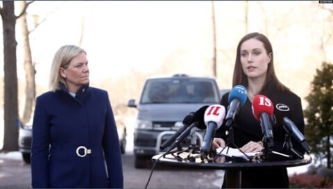 Tháng Giêng năm 2022, Thủ tướng Phần Lan Sanna Marin còn nói rằng tham gia khối NATO là một chuyện xa vời, khó xảy ra. Ngày 13 tháng 4, Bà Marin gặp Thủ tướng Thụy Điển Magdalena Andersson ; rồi tuyên bố đang xin khối NATO thu nhận. Bà Andersson cũng nói sẽ quyết định sớm.