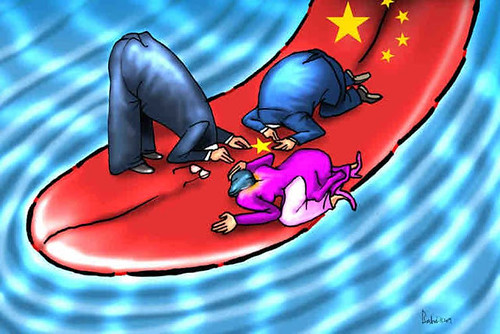 Bộ tam Đảng cộng sản Việt Nam bái lạy đường lưỡi bò - Tranh biếm họa