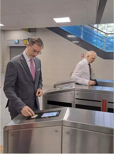 Đại sứ Pháp tại Việt Nam Olivier Brochet sử dụng tuyến đường sắt đô thị số 3 Hà Nội (Nhổn - Cầu Giấy). © Ambassade de France au Vietnam