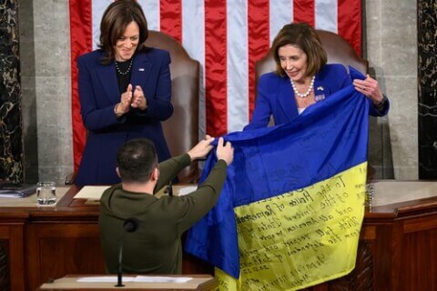 Tổng thống Zelensky trao lá cờ từ chiến trường Ukraine cho Chủ tịch Hạ viện Hoa Kỳ hôm 21/12/2022 - AFP