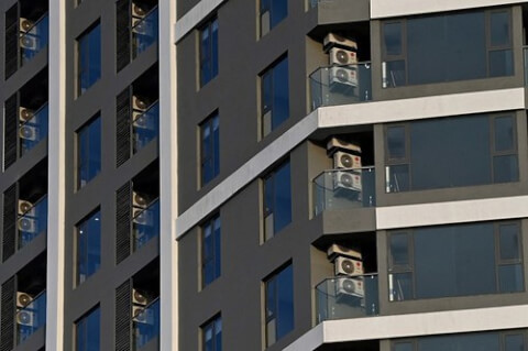 Bức ảnh này chụp ngày 30/5/2023 cho thấy các dàn điều hòa nhiệt độ ngoài trời trên một tòa nhà ở trung tâm Hà Nội. AFP