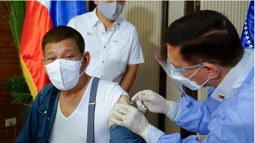 Tổng thống Philippines Rodrigo Duterte tiêm vac-xin của Sinopharm, hôm 03/05/2021 tại phủ tổng thống, Manila. AP - King Rodriguez