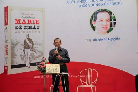 Nhà nghiên cứu Lê Nguyễn trong lần ra mắt sách của ông : "cuộc phiêu lưu của Marie đệ nhất - Quốc vương Sedang" tại Đường sách Thành phố Hồ Chí Minh / Ảnh : NVCC