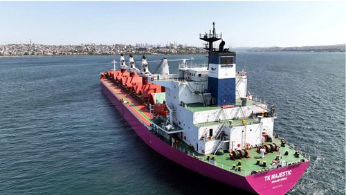 Tàu TK Majestic, mang cờ Saint-Kitts-and-Nevis, chở ngũ cốc trong khuôn khổ Sáng kiến Ngũ cốc Biển Đen, đang đợi thả neo tại cảng Bosporus Thổ Nhĩ Kỳ, ngày 15/07/2023. Reuters – Mehmet Caliskan