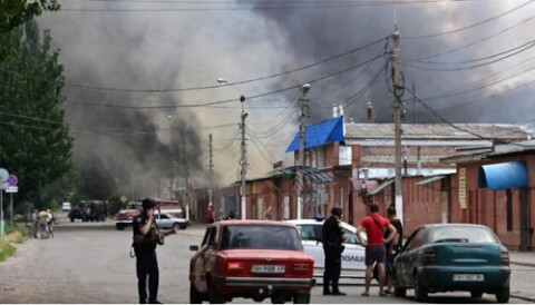 Ảnh minh họa: Khói bốc lên từ ngôi chợ trung tâm thành phố Sloviansk, ngày 05/07/2022. Thành phố ở tỉnh Donetsk này là mục tiêu bị quân Nga pháo kích liên tục.. AFP - MIGUEL MEDINA