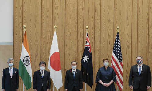 Bốn bộ trưởng ngoại giao Úc, Hoa Kỳ, Nhật Bản và Ấn Độ đã thảo luận về việc hỗ trợ các nước Ấn Độ Dương-Thái Bình Dương trong việc quản lý các tác động kinh tế và sức khỏe do virus corona. Họ đồng ý rằng điều tối quan trọng đối với nền kinh tế khu vực là có thể tiếp cận với vắc-xin an toàn và hiệu quả.