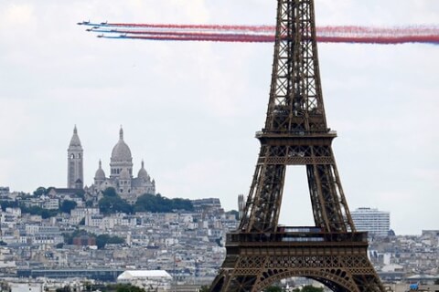 Máy bay phản lực Alpha của Không quân Pháp Patrouille de France bay ngang qua Tháp Eiffel với Vương cung thánh đường Sacre-Coeur, ngày 14/7/2024 – Reuters