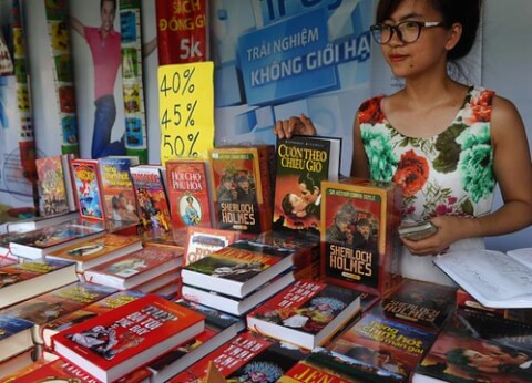 Nhân viên một Nhà xuất bản giới thiệu những tác phẩm nước ngoài ở Hà Nội. Ảnh chụp năm 2014. AFP