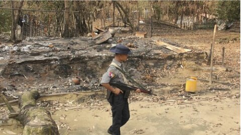 Binh sĩ quân đội Miến Điện tuần tra tại khi làng của người Rohingya bị tàn phá tại bang Rakhine, phía tây Miến Điện, ngày 06/09/2017. AP