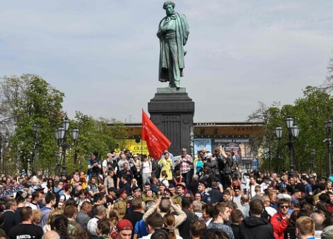 Người biểu tình tụ tập tại tượng đài Pushkin ở Moscow ngày 5/5/2018