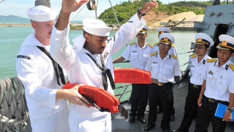 Thủy thủ Mỹ trên chiến hạm USS John S. McCain hướng dẫn kỹ thuật cứu nạn cho Hải quân Việt Nam. Ảnh chụp ngày 11/08/2010. U.S. Navy / Brock A. Taylor