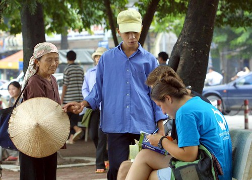 Một phụ nữ mù đi xin ăn (trái) ở Hà Nội năm 2002 (minh họa) - AFP