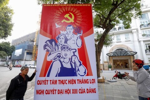 Công nhân dựng tấm biển chào mừng Đại hội 13 Đảng cộng sản Việt Nam trên đường phố Hà Nội hôm 12/1/2021. Reuters