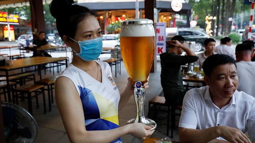Một phụ nữ phục vụ bia hơi ở một nhà hàng ở Hà Nội sau khi chính phủ Việt Nam dỡ bỏ cách ly toàn xã hội trong thời gian bùng phát dịch virus corona hôm 29/4. Nhà nước do Đảng cộng sản nắm quyền được ca ngợi thành công trong chống 'giặc' Covid-19 nhưng ít được thế giới biết tới.