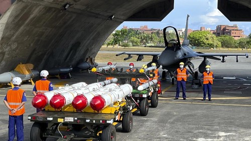 Tên lửa chống hạm Harpoon A-84 của Mỹ, tên lửa không đối không AIM/120, AIM-9 và máy bay chiến đấu F-16V trong buổi tập trận của Mỹ tại một căn cứ không quân phía đông nam Đài Loan, ngày 17/08/2022. AP - Johnson Lai
