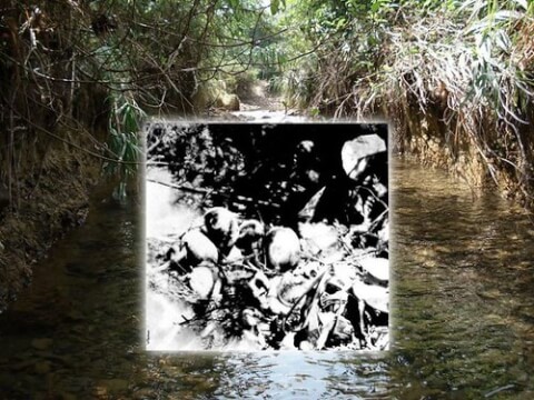 Xương cốt các nạn nhân nằm dồn dưới Khe Đá Mài (hình chụp tháng 10/1969)
