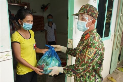 Quân đội đi phát lương thực đến nhà dân. Ảnh : Báo Lao Động.