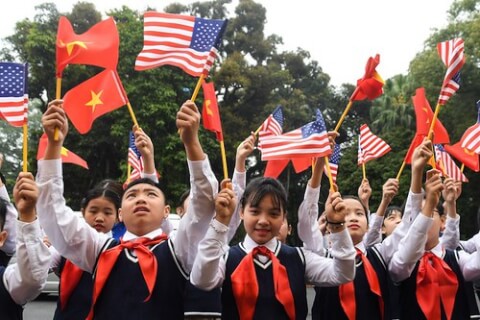 Các em học sinh Việt Nam vẫy cờ Việt Nam và cờ Mỹ ở Hà Nội nhân chuyến thăm của Tổng thống Donald Trump đến Việt Nam hôm 27/2/2019 - AFP