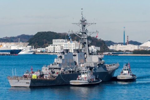 Tàu khu trục tên lửa dẫn đường lớp Arleigh Burke USS John S. McCain (DDG 56) được kéo đến bến tàu Yokosuka, Nhật Bản.