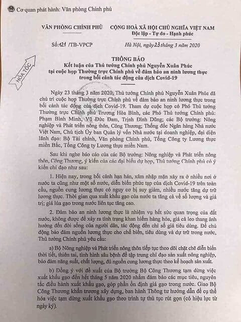 Công văn hỏa tốc ngày 23/3/2020 của Thủ tướng Chính phủ nêu rõ cuộc họp sáng 23/3/2020 do Thủ tướng chủ trì có thêm 4 phó thủ tướng khác, cùng với các bộ liên quan như Nông nghiệp, Công thương, các Tổng Công ty lương thực Miền Bắc, Miền Nam… nghĩa là đầy đủ mọi thành phần quan trọng nắm giữ sinh mệnh đất nước về lương thực.