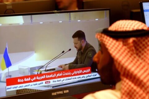 Các quan sát viên truyền thông theo dõi Tổng thống Ukraine Volodymyr Zelensky phát biểu tại hội nghị thượng đỉnh Liên đoàn Ả Rập ở Jeddah, Ả Rập Saudi, ngày 19/5/2023. Fayez Nureldine/AFP via Getty Images