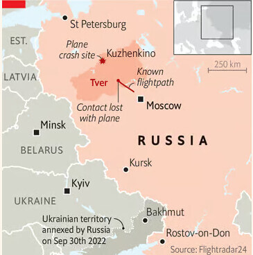 Theo dữ liệu theo dõi hàng không công khai, chiếc máy bay thương mại Embraer của Prigozhin đã bay lên độ cao gần 30.000 feet (9,1 km) trước khi bất ngờ rơi xuống khu vực Tver gần Moskva sau chưa đầy 30 phút bay. Theo cơ quan hàng không Nga và truyền thông nhà nước, tất cả 10 người trên máy bay đều thiệt mạng, và Prigozhin có tên trong danh sách hành khách. Dmitry Utkin, một nhân vật cấp cao trong Tập đoàn Wagner của Prigozhin, đồng thời là chỉ huy nhóm binh sĩ hành quân đến Moskva hồi tháng 6, cũng có tên trong danh sách hành khách.