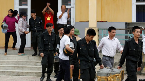 Người dân Đồng Tâm thả 38 con tin vào ngày 22/04/2017 khi Chủ tịch thành phố Hà Nội đến địa phương đối thoại. AFP