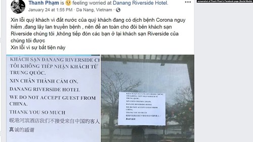 Trước đó, hôm 26 tháng 1, đoàn công tác công an thành phố Đà Nẵng yêu cầu khách sạn Danang Riverside gỡ bảng không nhận khách Trung Quốc với lý do gây ảnh hưởng đến tình hình an ninh du lịch, tình hình đối ngoại của thành phố. Phía khách sạn không đồng ý gỡ bảng.