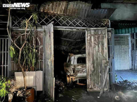 Hình ảnh hiện trường cho thấy khung xe chiếc xe hơi giống như xe VF3 của Vinfast nằm ngay vị trí cửa ra vào, tức nằm ở vị trí bùng phát hỏa hoạn, khiến các nạn nhân ở trong nhà không ra ngoài được.