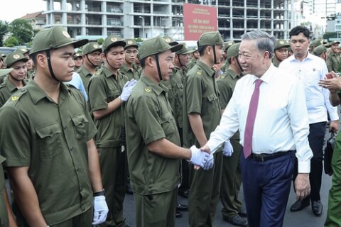 Chủ tịch nước Tô Lâm thăm hỏi lực lượng tham gia bảo vệ an ninh, trật tự tại Thành phố Hồ Chí Minh ngày 1/7/2024. Ảnh : VPCTN