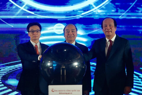 Thủ tướng Nguyễn Xuân Phúc, Phó Thủ tướng Vũ Đức Đam và Chủ nhiệm Văn phòng Chính phủ Mai Tiến Dũng bấm nút khai trương Cổng dịch vụ công quốc gia ngày 9/12/2019