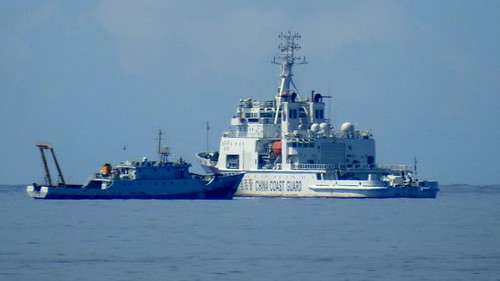 Tàu hải cảnh 3501 neo cạnh tàu nghiên cứu biển 20026 cạnh bãi Gạc Ma thuộc Trường Sa của Việt Nam vào tháng 4/2016. Tàu này hiện đang bảo vệ tàu Hải dương Địa chất 8 hoạt động trái phép trong thềm lục địa Việt Nam từ đầu tháng 7/2019 - Ảnh minh họa (Thanh Niên, 24/07/2019)