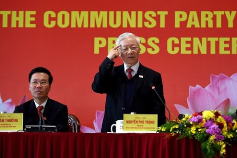 Ông Võ Văn Thưởng và tổng bí thư Nguyễn Phú Trọng trong cuộc họp báo bế mạc Đại Hội đảng cộng sản Việt Nam lần thứ 13, tại Trung tâm Hội nghị Quốc gia, Hà Nội, Việt Nam, ngày 01/02/2021. AFP – Nhac Nguyen