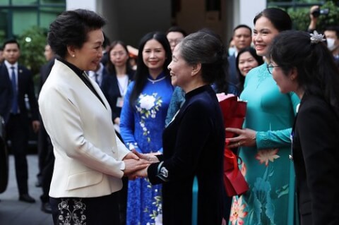 Bà Ngô Thị Mân, phu nhân Tổng bí thư Đảng cộng sản Việt Nam Nguyễn Phú Trọng, bắt tay bà Bành Lệ Viện, phu nhân Chủ tịch Trung Quốc Tập Cận Bình, tại Bảo tàng Phụ nữ Việt Nam ở Hà Nội vào ngày 12 tháng 12 năm 2023. AFP - Ảnh minh họa