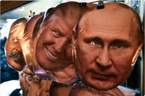 Mặt nạ hình tổng thống Nga Vladimir Putin và tổng thống Mỹ tân cử Donald Trump tại một cửa hiệu đồ lưu niệm tại Saint-Petersbourg, Nga, ngày 06/11/2024. AP - Dmitri Lovetsky