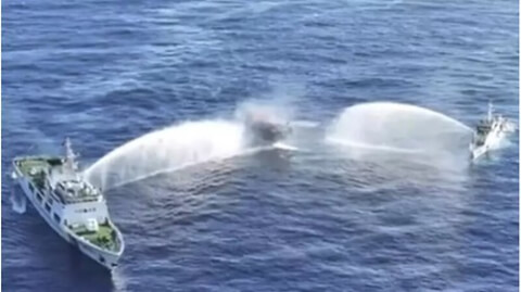 Tàu tiếp tế Unaizah của Philippines (ở giữa), bị hai vòi rồng của lực lượng bảo vệ bờ biển Trung Quốc bắn trúng, khiến nhiều thành viên thủy thủ đoàn bị thương khi đang tiến vào Bãi Cỏ Mây (Second Thomas), trên biển Đông, ngày 05/03/2024. © AP/Philippine Coast Guard