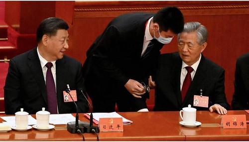 Tổng bí thư Trung Quốc Tập Cận Bình nhìn cựu lãnh đạo Hồ Cẩm Đào rời hội nghị tại phiên họp bế mạc ngày 22/10/2022. AFP – Noel Celis