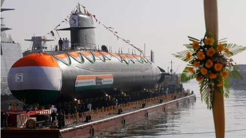 Tầu ngầm lớp Scorpène thứ hai, do tập đoàn Pháp Naval Group đóng và được giao cho Ấn Độ, hạ thủy tại khu cảng đóng tầu Mazagon ở Mumbai, ngày 12/01/2017. AP - Rafiq Maqbool