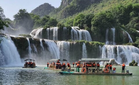 Khách du lịch Việt Nam và Trung Quốc tại Thác Bản Giốc hôm 12/3/2017. Thác ở biên giới giữa hai nước thuộc tỉnh Cao Bằng - AFP