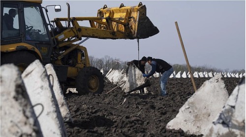 Ukraine dựng hệ thống phòng thủ "Răng Rồng" gần biên giới với Nga và tỉnh Kharkiv. Ảnh ngày 17/04/2024. AP - Evgeniy Maloletka