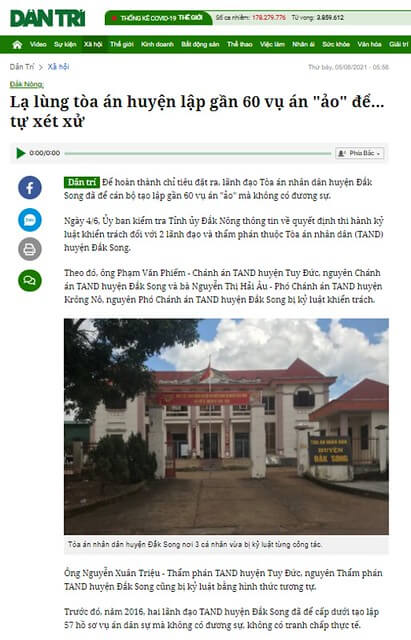 Tư pháp luôn gánh toàn bộ chức năng thứ tư và làm cầu nối giữa pháp luật và công lý. Quyền lực tư pháp luôn được các nước nhìn nhận là thuộc về các thẩm phán, bởi chính họ là người giải thích luật và đưa ra các phán quyết. Vậy không có lý gì hay thực tế nào khiến các thẩm phán bị thao túng để phải hành xử gian dối như bài báo Lạ lùng tòa án huyện lập gần 60 vụ án ‘ảo’ để… tự xét xử, đăng trên báo điện tử Dân Trí ngày 5-6-2021.