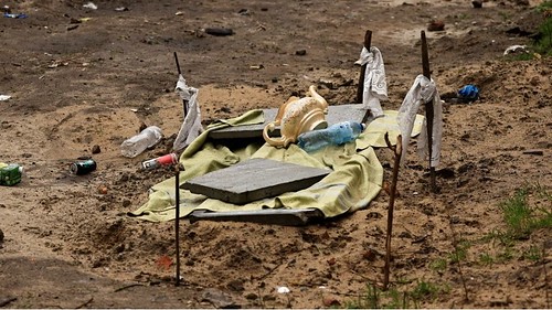 Hố chôn hai người ngay trong vườn khu dân cư. Các nhân chứng khẳng định nhìn thấy lính Nga bắn chết hai người này, Bucha, Ukraine, ngày 03/04/2022. Reuters – Zohra Bensemra