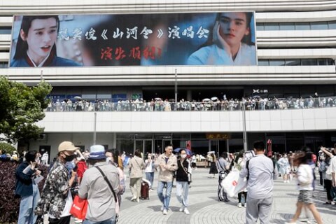 Các fans đứng đợi bên ngoài Trung tâm Thể thao Olympic Tô Châu trước một buổi biểu diễn trực tiếp với chủ đề về các phim truyền hình Trung Quốc nổi tiếng thế giới hôm 3/5/2021 - AFP