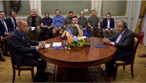 Gần 6 tháng sau khi Nga phát động cuộc chiến tranh xâm lược Ukraine, hôm 18/08/202, tại Lviv, tổng thư ký Liên Hiệp Quốc Antonio Guterres gặp tổng thống Ukraine Volodymyr Zelensky và tổng thống Thổ Nhĩ Kỳ Recep Tayyip Erdogan.
