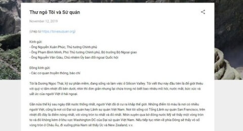 Bức thư ngỏ gửi các lãnh đạo cấp cao Việt Nam của kỹ sư Dương Ngọc Thái được đăng trên blog cá nhân và trang "Tôi và Sứ quán"