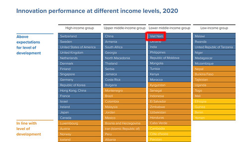 Theo đó, WIPO phân tích các nước đổi mới nhất trong từng nhóm thu nhập của Ngân hàng Thế giới (WB), dựa trên dữ liệu từ Chỉ số Đổi mới Toàn cầu (GII) của WIPO ; từ đó, đưa ra thứ tự trong bảng xếp hạng năm 2020.
